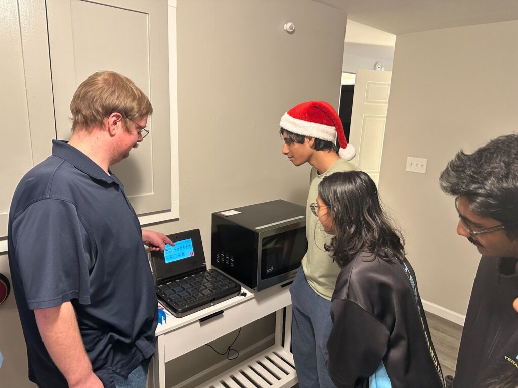 Initially, we introduced a little about our team and robot, but primarily explained our assistive technology journey. After this, we were shown around the smart home, which is a regular house that has many off-the-shelf technologies. These devices make independent living more accessible to individuals with intellectual disabilities. The tour of the smart home was especially interesting to see the function of these different tools like Amazon Alexas, medication reminder devices, smart wall buttons, and even lights triggered by weighted sensors in mattresses, which optimized the quality of living inside this house. It was nice to see similarities in our assistive devices as well, often with large buttons that grant easier access. Our team had many questions throughout this experience.